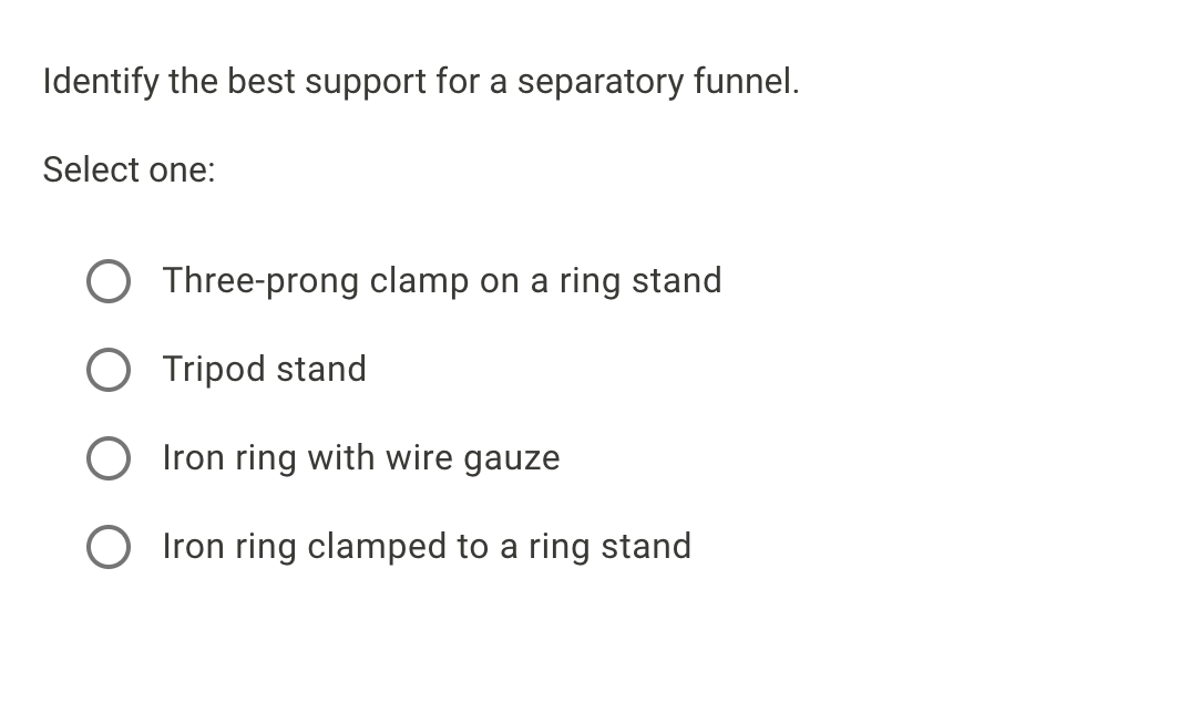 Iron ring clamped to a. Our polypropylene Separatory Funnel Holder accepts support rods between 95mm and 125mm in diameter. Q7 Identify the best support for a separatory funnel.