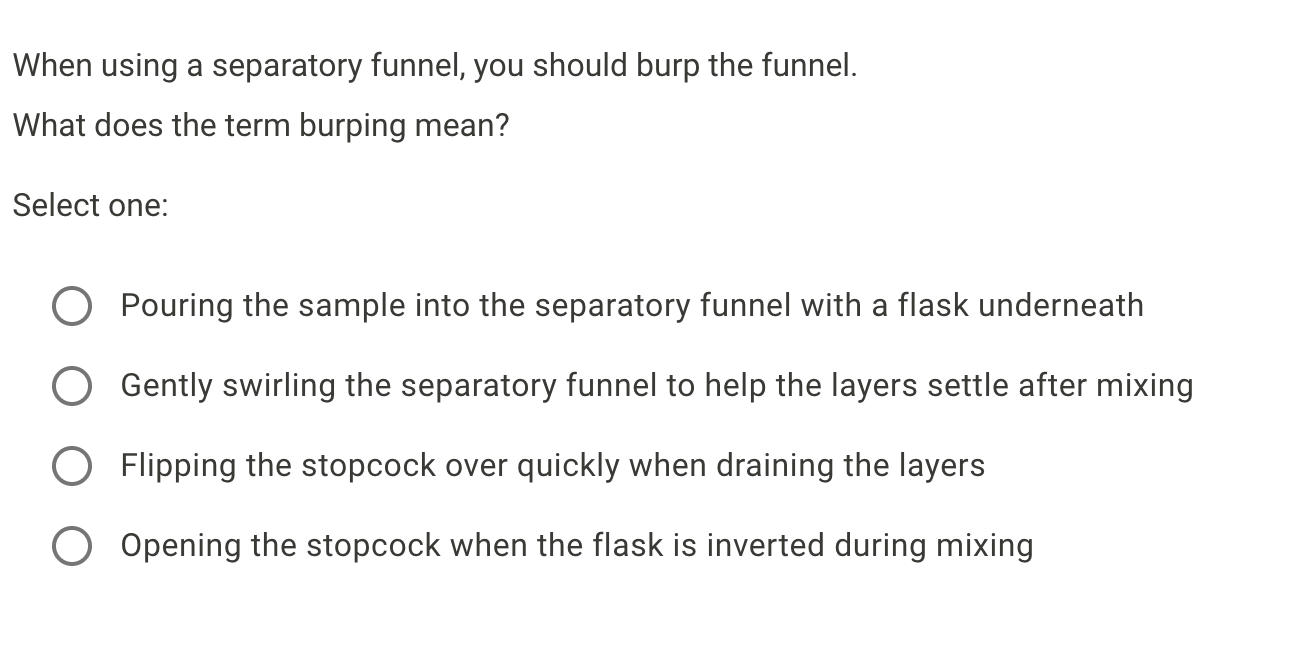 This answer is not useful. Leaves desired compound in its starting layer 2. Three-prong clamp on a ring stand Tripod stand Iron ring with wire gauze O Iron ring clamped to a ring stand When using a separatory funnel you should burp the funnel.